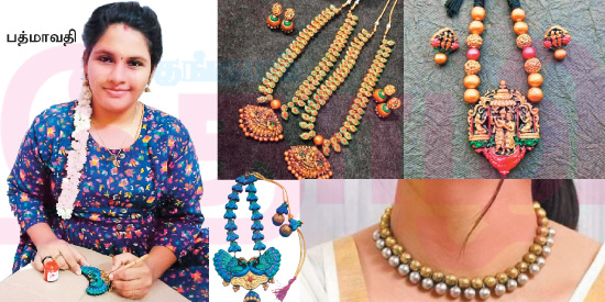 பத்மாவதியின் சொந்த ஊர் பரமக்குடி. திருமணமாகி இப்போது சென்னையில் செட்டிலாகி விட்டார். பி.எஸ்சி வேதியல் படித்துள்ள இவர், நெசவாளர் குடும்பத்தைச் சேர்ந்தவர். எப்போதுமே வீட்டில் தன் குடும்ப உறுப்பினர்களுடன் சேர்ந்து நெசவு வேலையில் உதவி வருவார். ‘‘ஆனால் இங்கு சென்னை வந்ததும் வீட்டு வேலையை தாண்டி, பொழுதுபோக்கு என எதுவும் இல்லாததால் மிகவும் தனிமையாக உணர்ந்தேன். யுடியூப்பில் சாதாரணமாக ஒரு வீடியோ பார்த்துக் கொண்டிருக்கும் போது அதில் வந்த டெரக்கோட்டா ஜுவல்லரி மேக்கிங்கை பார்த்து அதை வீட்டில் முயற்சி செய்யலாம் என முடிவு செய்தேன். என் கணவர் தான், இதற்கு தேவையான க்ளேவை எனக்கு முதலில் வாங்கி கொடுத்தார்.
