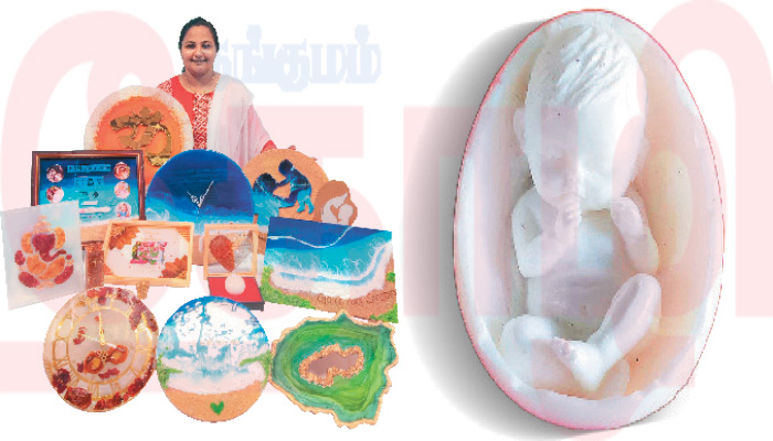 வாழ்வில் உன்னதமான நிகழ்வு என்பது குழந்தை பேறு. அந்தக் காலகட்டத்தில் பயன்படுத்தப்படும் ப்ரக்னன்சி டெஸ்ட் கிட், தொப்புள் கொடி, குழந்தையின் நகம், முடி, அரைஞாண் கொடி, வளையல் போன்றவைகளை பாதுகாத்து பிரேஸ்லெட், டாலர் செயின், ஹோம் டெக்கராகவும் செய்து தருகிறேன்.