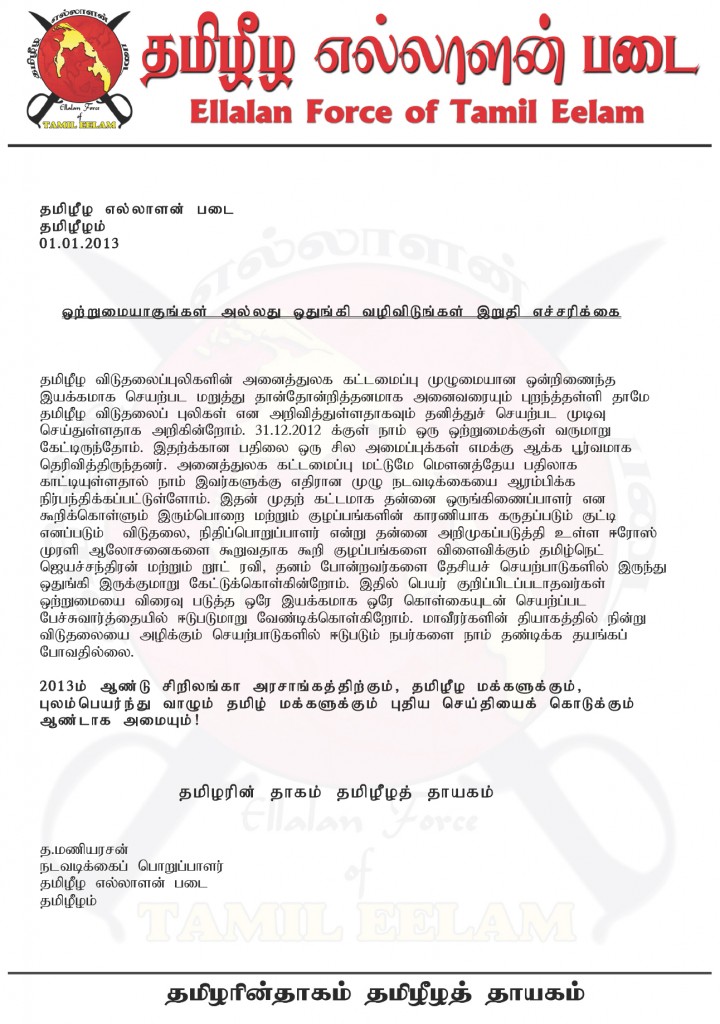 • ஒற்றுமையாகு​ங்கள் அல்லது ஒதுங்கி வழிவிடுங்க​ள் இறுதி எச்சரிக்கை​ -தமிழீழ எல்லாளன் படை