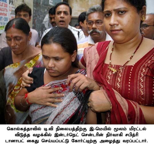 B-98, KOL – 310704 – JULY 31, 2008 – Kolkata: Sabitri Dandapat (C), who runs Kaushik Basu’s Cyber Cafe, from where a hoax e-mail sent to a TV channel, being produced at a city court in Kolkata on Thursday. PTI Photo by Swapan Mahapatra