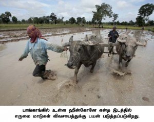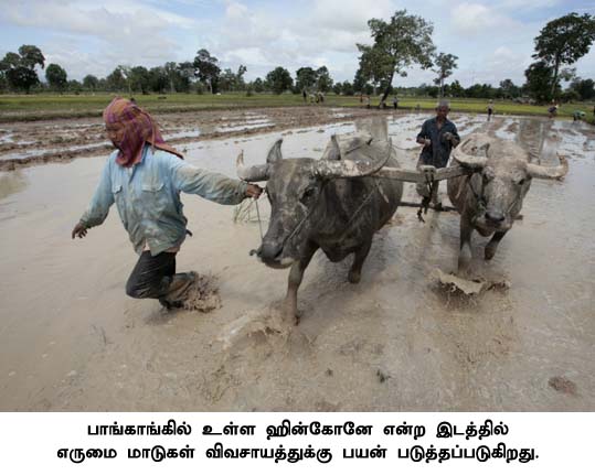Thai farmers plough their field with their water buffalo at a paddy field in Hinkone village, 450 km northeast of Bangkok, July 19, 2008. Struggling to cope with soaring food and fuel prices, Thai rice farmers are swapping diesel-fuelled tractors for water buffalo, the beasts used for ploughing the paddy fields for centuries. Picture taken July 19, 2008. REUTERS/Sukree Sukplang (THAILAND)