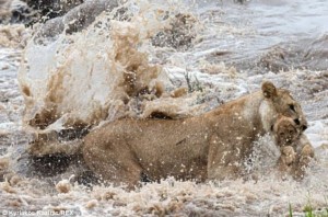 • வாயில் குட்டி, ஆற்றில் வெள்ளம், கடக்கும் தாய்ச் சிங்கம்!! (படங்கள்)
