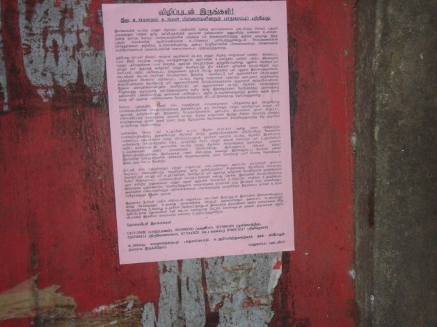 ‘இது உங்களதும் உங்கள் பிள்ளைகளதும் பாதுகாப்பு பற்றியது’ என தலைப்பிட்டு துண்டுப்பிரசுரங்கள் பரவலாக ஒட்டப்பட்டுள்ளதாக பிரதேச மக்கள் தெரிவித்துள்ளனர்.