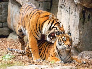 CAPTION: (Tampa) Eric, a male Sumatran tiger, bits the back of Enshalla’s neck during an attempt to breed the tigers. (STEFANIE BOYAR | Times) Summary: Photos for Tom French’s Zoo Story about Lowry Park Zoo.