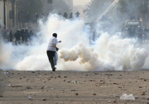 DEMONSTRATOR PREPARES TO THROW TEAR GAS CANISTER BACK AT POLICE IN CAIRO