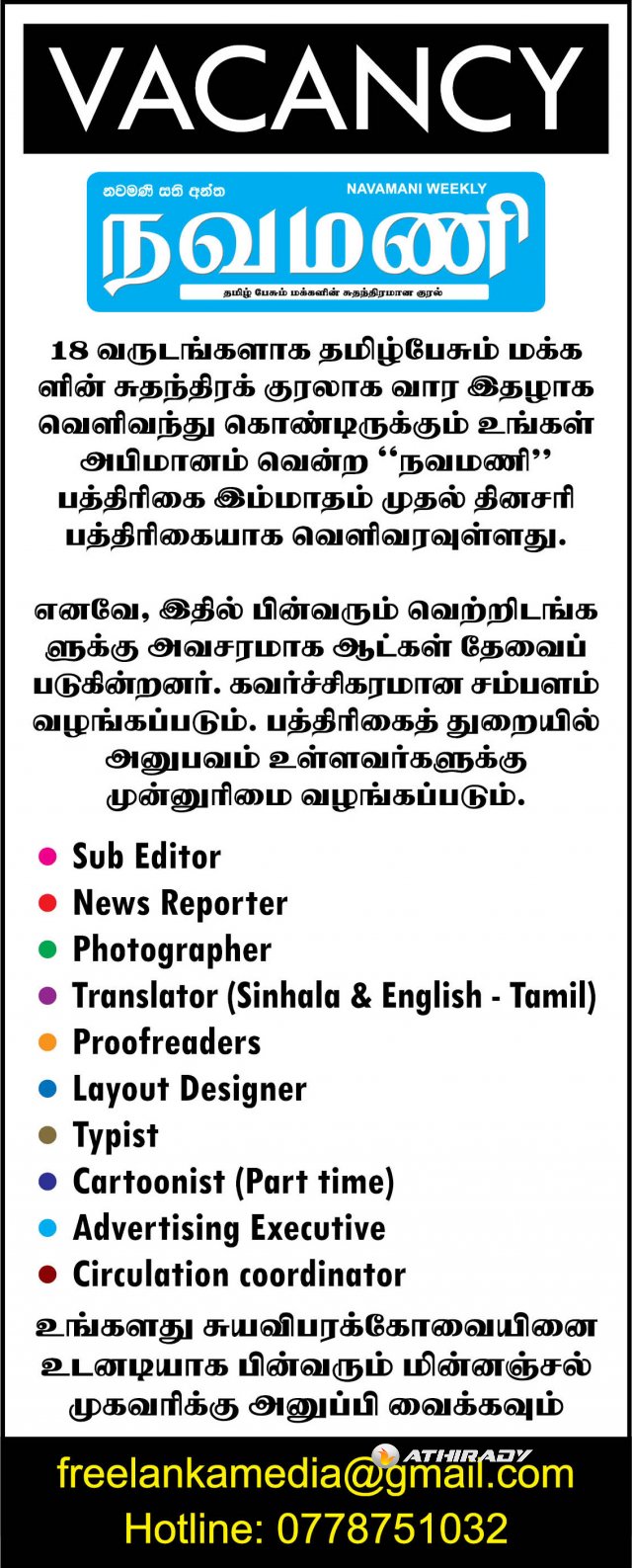 • தினசரியாக வெளிவரவுள்ள நவமணி பத்திரிகையில் பதவி வெற்றிடங்கள்..!