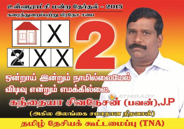 எமது பிரதேசங்களில் எங்கள் மண்ணை அபிவிருத்தி செய்ய, எங்கள் தேவைகளை பூர்த்தி செய்ய எங்கள் கைகளிலேயே பிரதேசசபை இருத்தல் வேண்டும். தமிழ் தேசியத்தை வலியுறுத்தி -தமிழ் மக்களுக்காக தமிழ் மக்களாலேயே- உருவாக்கப்பட்ட தமிழ் தேசிய கூட்டமைப்பிற்கே உங்கள் வாக்குகளை அளித்து தமிழர்களின் வாழ்வையும் இருப்பையும் உறுதிசெய்து எங்களுக்கான அபிவிருத்திகளை நாங்களே தீர்மானிப்போம்.
