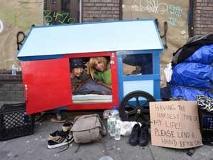 • நியூயார்க் நகரில் வீடற்ற தம்பதியர் நாய் வண்டியில் தூங்கும் அவலம்!!