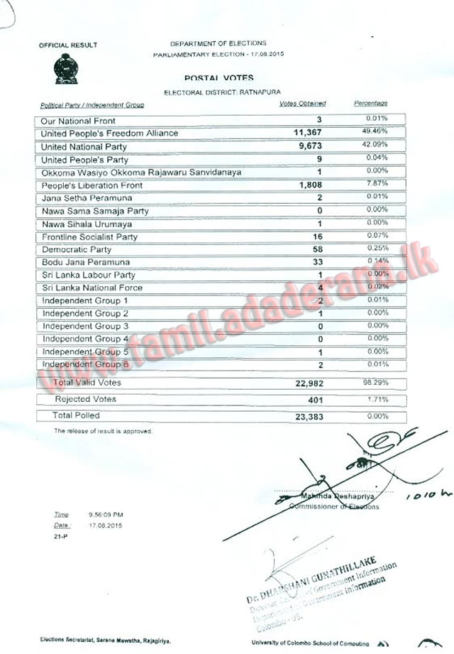 • இரத்தினபுரி தபால் மூல வாக்கு முடிவில் ஐமசுமு வெற்றி!!